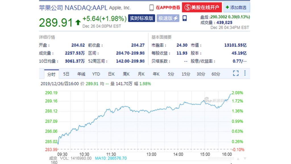 周四收盘 苹果股价报收289.91美元创新高
