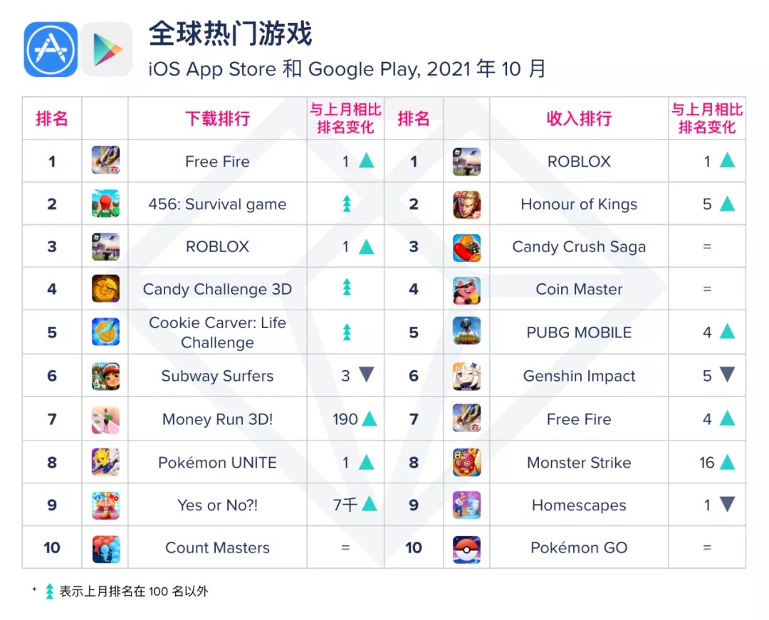 收入榜方面,ROBLOX 重回第一。《王者荣耀》在国际赛氛围下收入环比增加 38%、下载量环比增加超越 20%。《怪物弹珠》Monster Strike 迎来8周年庆祝,全球收入跃升 16 名,环比九月增加超越 100%。
